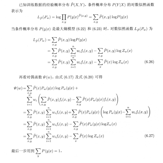 这样最大熵模型的学习问题就可以转换为具体的求解对数似然函数极大化或对偶函数极大化的问题;写成更一般的形式